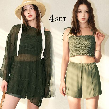 ビキニ、ショーツ、ショートパンツ、トップスの4点セットです。