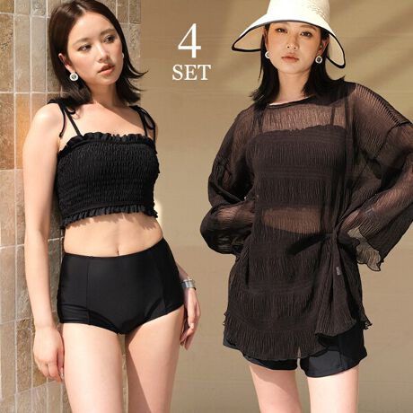 ビキニ、ショーツ、ショートパンツ、トップスの4点セットです。