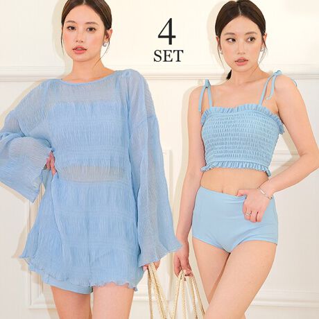 ビキニ、ショーツ、ショートパンツ、トップスの4点セットです。