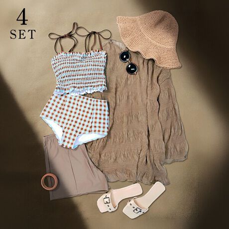 ビキニ、ショーツ、ショートパンツ、トップスの4点セットです。