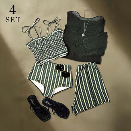 ビキニ、ショーツ、ショートパンツ、トップスの4点セットです。