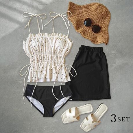 装飾的なギャザーが甘さとメリハリを引き出す、シャーリングビキニのセット水着。