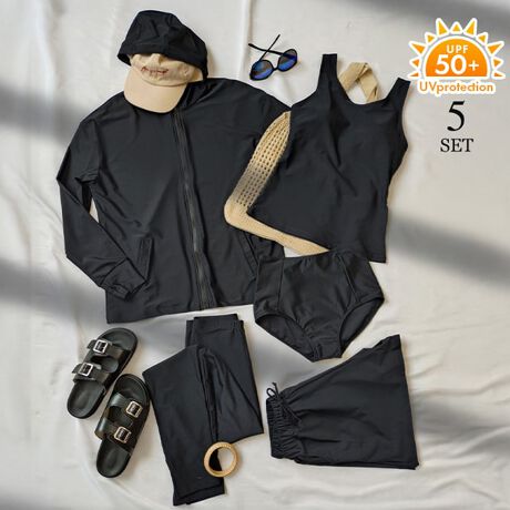 ラッシュガード、タンクトップビキニ、ショーツ、ショートパンツ、レギンスの5点セットです。