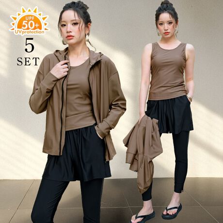 ラッシュガード、タンクトップビキニ、ショーツ、ショートパンツ、レギンスの5点セットです。