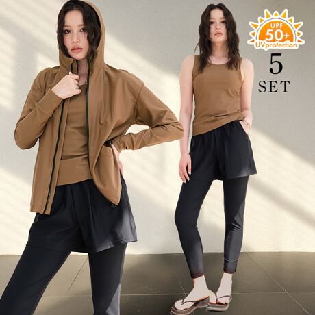 ラッシュガード、タンクトップビキニ、ショーツ、ショートパンツ、レギンスの5点セットです。