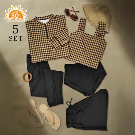 ラッシュガード、タンキニ、ショーツ、ショートパンツ、レギンスの5点セットです。