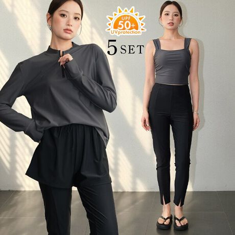 ラッシュガード、タンキニ、ショーツ、ショートパンツ、レギンスの5点セットです。
