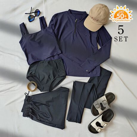 ラッシュガード、タンキニ、ショーツ、ショートパンツ、レギンスの5点セットです。