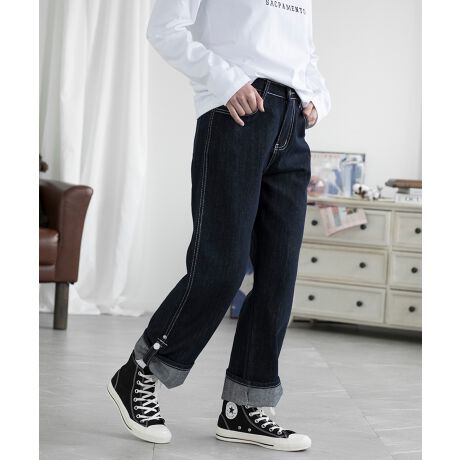 ハイウエストでストレートワイドデニムなので脚長効果があり、様々な体型の方に合います!定番のデニムですが、裾部分にロールアップ用のベルトが付いており、長さに合わせて固定できるデザインです!スニーカーやショートブーツなど合わせる靴やスタイルによってパンツの長さを変えられるのが嬉しいポイント。定番のデニムなのでトップスはどんなものにでも合わせやすく、ブラウスやキレイめのカットソーと合わせるときはそのままで、Tシャツやスウェットなどのアイテムと合わせるときはロールアップするとカジュアルにコーディネートがまとまります!通気性があり、縮みにくいデニムなので扱いやすく長く着ていただけます。
