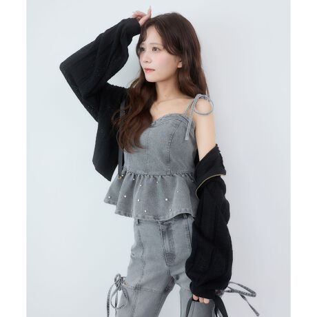 コンパクトな丈感でウエスト位置を高く見せてくれるため、自然とスタイルアップが叶うのも嬉しいポイント。ゴールドファスナーとサテンリボンが上品なアクセントになり、ラフになりすぎずきれいめなスタイリングにも相性抜群◎