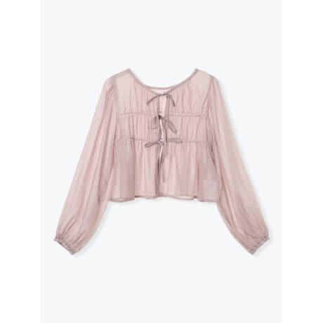 [型番:26550730342]ラメを織り込んだシアー素材が軽やかなブラウス。フロントのリボンデザインが華やかなアクセントになり、女性らしい印象を引き立てます。デニムでカジュアルダウンした着こなしや、ナロースカートと合わせたきれいめコーデも楽しめます。スタイリングにやわらかなニュアンスを添えてくれる一枚です。