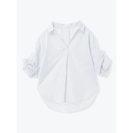 [型番:26550729725]爽やかなストライプ柄が目を引く、スキッパーデザインのシャツ。程よくゆとりのあるサイズ感で、デニムやワイドパンツを穿いて大人カジュアルに、テーパードパンツやタイトスカートと合わせてきれいめにも。一枚で着映えする、着回し力の高いアイテムです。モデル(青着用)身長:165cmMサイズ着用