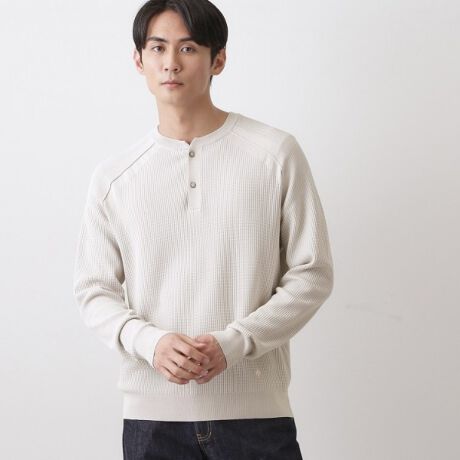 ワッフル編みで、ラグランの縫い代まわりなどを天竺組織にすることでニットらしいデザインになっています。