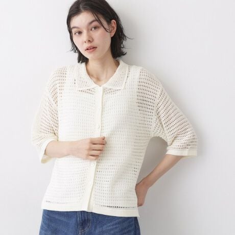 繊細な透かし編みで軽やかに仕上げた、襟付きのニットカーディガン。
