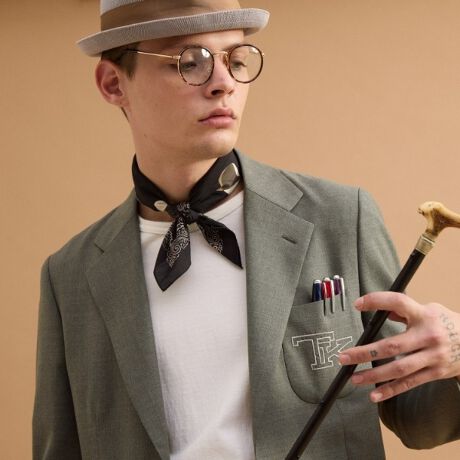 古いアーカイブ資料から発掘されたTKのロゴを胸ポッケに刺繍して、架空のタケ先生チームのブレザーを企画しました。