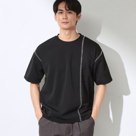 異素材の切り替えデザインが印象的な半袖Tシャツ。