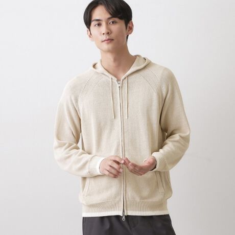 ペーパーブレンドの糸を使用したニットジップパーカ。