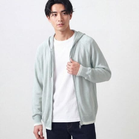 ペーパーブレンドの糸を使用したニットジップパーカ。