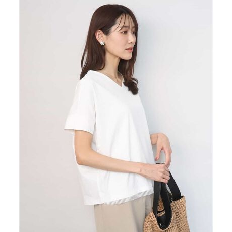 身幅にゆとりを持たせたやっこ型シルエットがこなれた抜け感を演出するプルオーバー。前身頃に重ねたストライプ柄のチュールがポイント。同系色のストライプが奥行きを生み出し、カットソー特有のカジュアルさを抑え、ブラウスのような上品なルックに仕上げました。