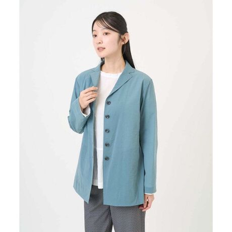 ベーシックなラインで仕上げた一重デザインのライトジャケット。小ぶりなテーラー衿とボタンワークでフェミニンで上品な印象に仕上げました。ストレッチ性が高い素材特性を活かし、きれいなシルエットラインに仕上げました。また、アームホールをパイピング仕様にし、前身頃に薄いメッシュを使い合わせてきちんと感のあるデザインに仕上げました。
