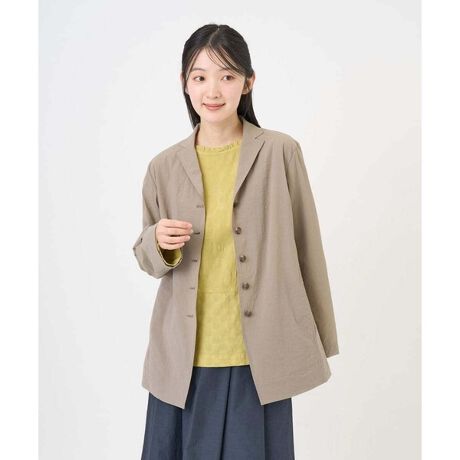 マットな表情でタウンにもカジュアルにも合わせやすい素材のジャケットです。軽くて上品なジャケットは、旅先にも重宝します。使いやすいカラーバリエーションで、合わせるボトムは、パンツでもスカートでもバランスよくお楽しみいただけます。