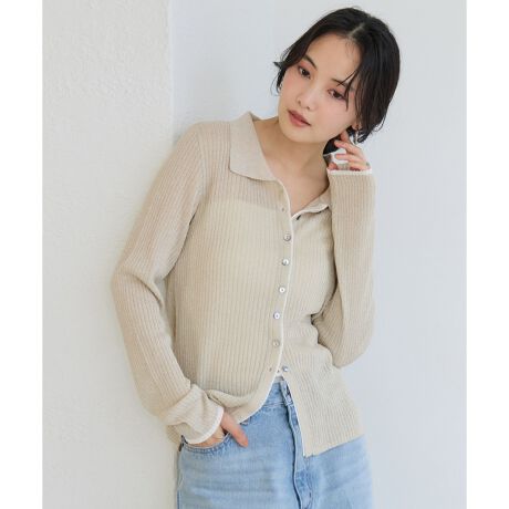 ポロ襟配色シアーリブカーディガン/イージーケア