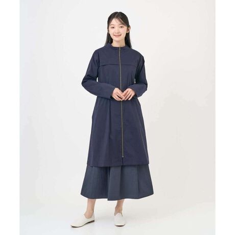 軽やかでシャイニーな素材を使用した、前開きファスナー仕様のロングコートです。前立て横から後ろのにかけてウエストにゴムを入れて、自然なギャザーを施しているので、女性らしいメリハリのあるシルエットを楽しめます。胸元には前後タックを取り入れ、フラットにならず豊かな表情を生むデザインに仕上げました。アクティブに、そして上品に着こなせる一着で、デイリーからお出かけまで幅広く活躍します。