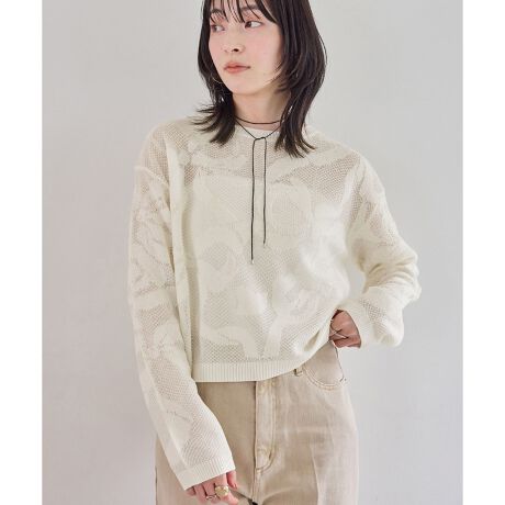 大人でも着られる甘すぎない、総柄風のオリジナルのリボン柄をメッシュジャカードで表現。ボクシーなシルエットで程よくリラックス感があり、ボトムアウトスタイリングが決まるサイズ感。ドライタッチで程よい透け感で女性らしい印象に。