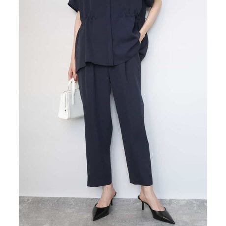 裾に向かって細く見える、美脚シルエットテーパードパンツ。ウエスト部分は総ゴムでストレスフリー、共地の紐先にゴールドパーツをあしらいデザインポイントに。