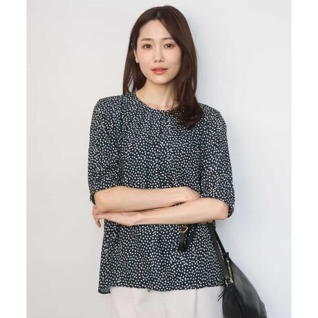 花びらのようなプリントが女性らしい印象のブラウス。主張しすぎない柄感はどんなシーンにも馴染みやすく着こなしやすさがあります。袖丈は肘にかかる程度のやや長めの五分袖で、気になる二の腕もふんわりカバーしてくれます。