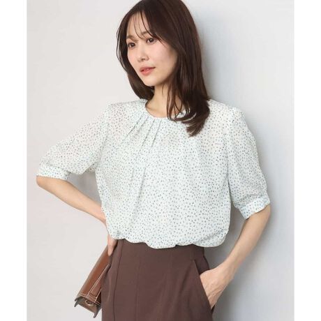 花びらのようなプリントが女性らしい印象のブラウス。主張しすぎない柄感はどんなシーンにも馴染みやすく着こなしやすさがあります。袖丈は肘にかかる程度のやや長めの五分袖で、気になる二の腕もふんわりカバーしてくれます。