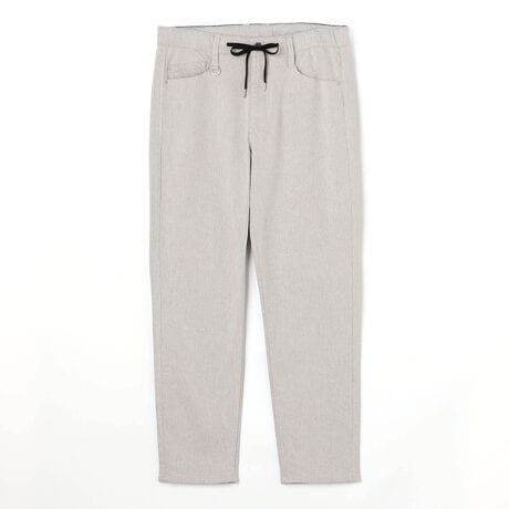 ウエストベルトに平ゴムを通し、表出しスピンドル仕様の5ポケットデザインイージーパンツ。