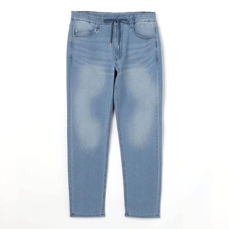 ウエストベルトに平ゴムを通し、表出しスピンドル仕様の5ポケットデザインイージーパンツ。