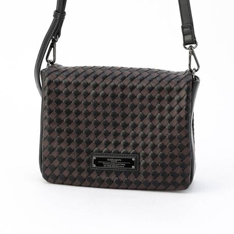 ツヤ感のある合成皮革をメッシュ調に編み込んだフラップデザインの高級感溢れるショルダーバッグ。