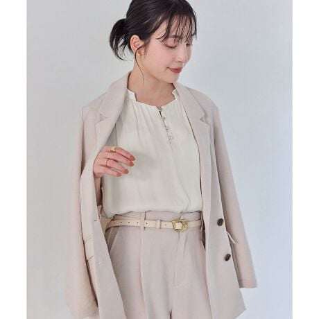ラメ楊柳で素材に特徴があるのでボウタイで華やぎを持たせつつ、フォルムはシンプルに。イン・アウト両方のスタイリングが決まるサイズ感です。程よい透け感で気になる袖をカバー。ジャケットのインにしてもごわつかず、お仕事にもおすすめな1枚です。身頃のみ裏地付きで安心感も◎