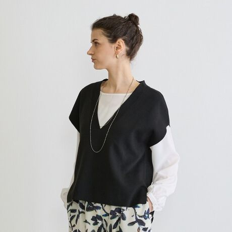 Vあきのベストは首元をスッキリと、ノーカラーのブラウスはレイヤードしやすいデザイン◎