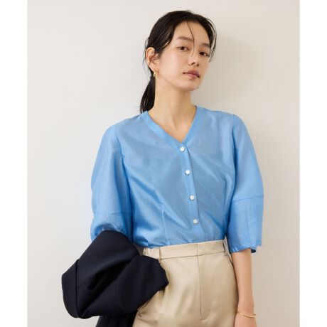 コンパクトなシルエットながら、Vネックが顔まわりをすっきりと見せ、女性らしいラインを美しく引き立てます。