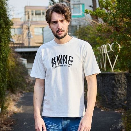 胸にフロッキープリントとインクジェットプリンターをグラデーションになるようにデザインしたロゴプリント半袖Tシャツになります。