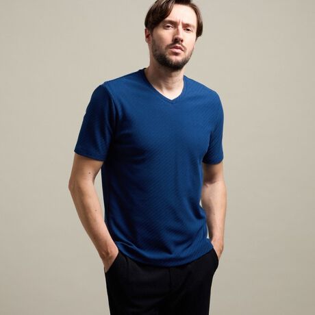 オリジナル矢羽根柄ジャカード生地を使用した、浅めのVネック半袖プルオーバーになります。