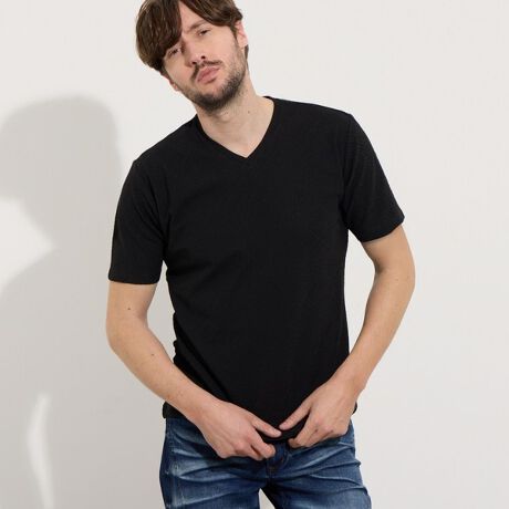 オリジナルバーク風リンクスジャカード生地をバイヤス仕様にした浅めのVネック半袖プルオーバーになります。