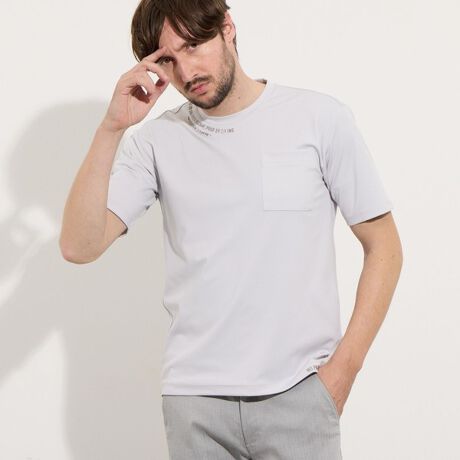 衿と裾にメタルジェルプリントを施したポケット付き半袖プルオーバーになります。