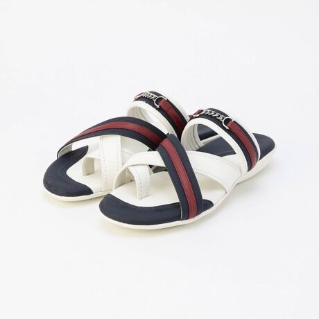 ビット金具をアクセントにした配色デザインのトングサンダル。