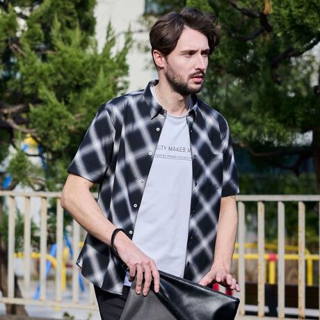 先染めのオンブレチェックを大胆にバイアス(斜め)にカットして他にはないデザインにしております。