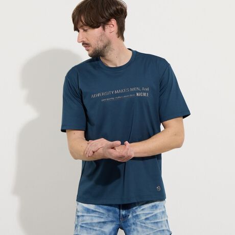 シャープな印象をあたえるメタルジェルプリントが目を惹くクルーネックTシャツになります。