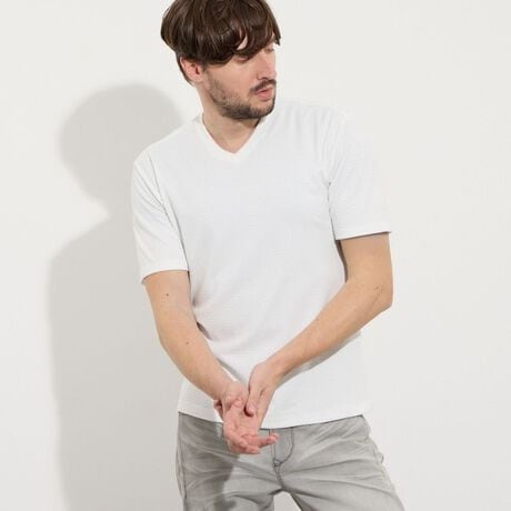 サラッとしたタッチ感と光沢のあるリンクスジャガード生地を使用した浅めのVネック半袖プルオーバーになります。
