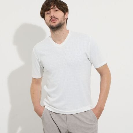 サラッとしたタッチ感と光沢のあるリンクスジャガード生地を使用した浅めのVネック半袖プルオーバーになります。