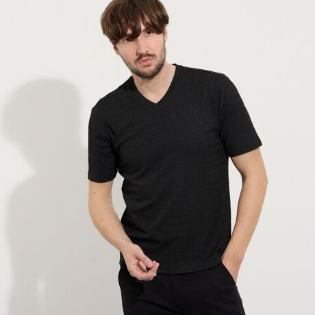 サラッとしたタッチ感と光沢のあるリンクスジャガード生地を使用した浅めのVネック半袖プルオーバーになります。