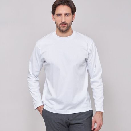 上質な細い綿糸を表裏2枚重なるように編んだ、適度な膨らみ感と滑らかな表面の生地です。仕上げに光沢感の出る加工を施すことで、毛羽の少ないきれいな目面で柔らかい風合いに仕上がりました。
