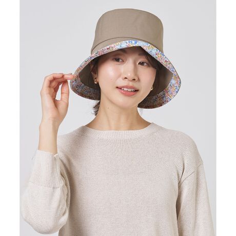 ツバ裏にリバティプリントをあしらった、さりげなく見える柄が大人可愛いハット。上品にあしらわれたリバティ柄は、派手になりすぎず顔周りをパッと華やかに演出します。後ろに向かってツバを長くしたアシンメトリーなデザインは、気になる首の後ろの日差しもしっかりと防ぎます。また、シワを気にせず小さく畳んでバッグに入れて持ち運べるため、夏のご旅行やレジャーにもぴったりです。内側のテープでサイズ調節ができ、ご自宅で手洗いも可能な実用性の高さも魅力。ギフトとしてもおすすめのアイテムです。カラーは、肌なじみの良いベージュ(#033)とシックなカーキ(#054)にはMichelle(ミシェル)を、知的な印象のネイビー(#075)にはRachel(レイチェル)の柄をツバ裏に使用した3色展開です。