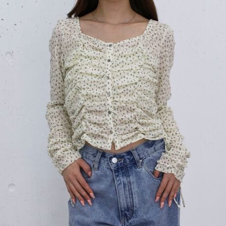 ・胸元のギャザー、サイドのドロスト、袖口のギャザーと、全体にくしゅっと感をプラスしたデザイン